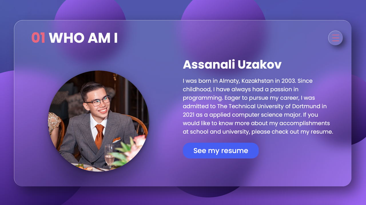 I was born in Almaty, Kazakhstan in 2003. Since childhood, I have always had a passion in programming. Eager to pursue my career, I was admitted to The Technical University of Dortmund in 2021 as a applied computer science major. If you would like to know more about my accomplishments at school and university, please check out my resume.