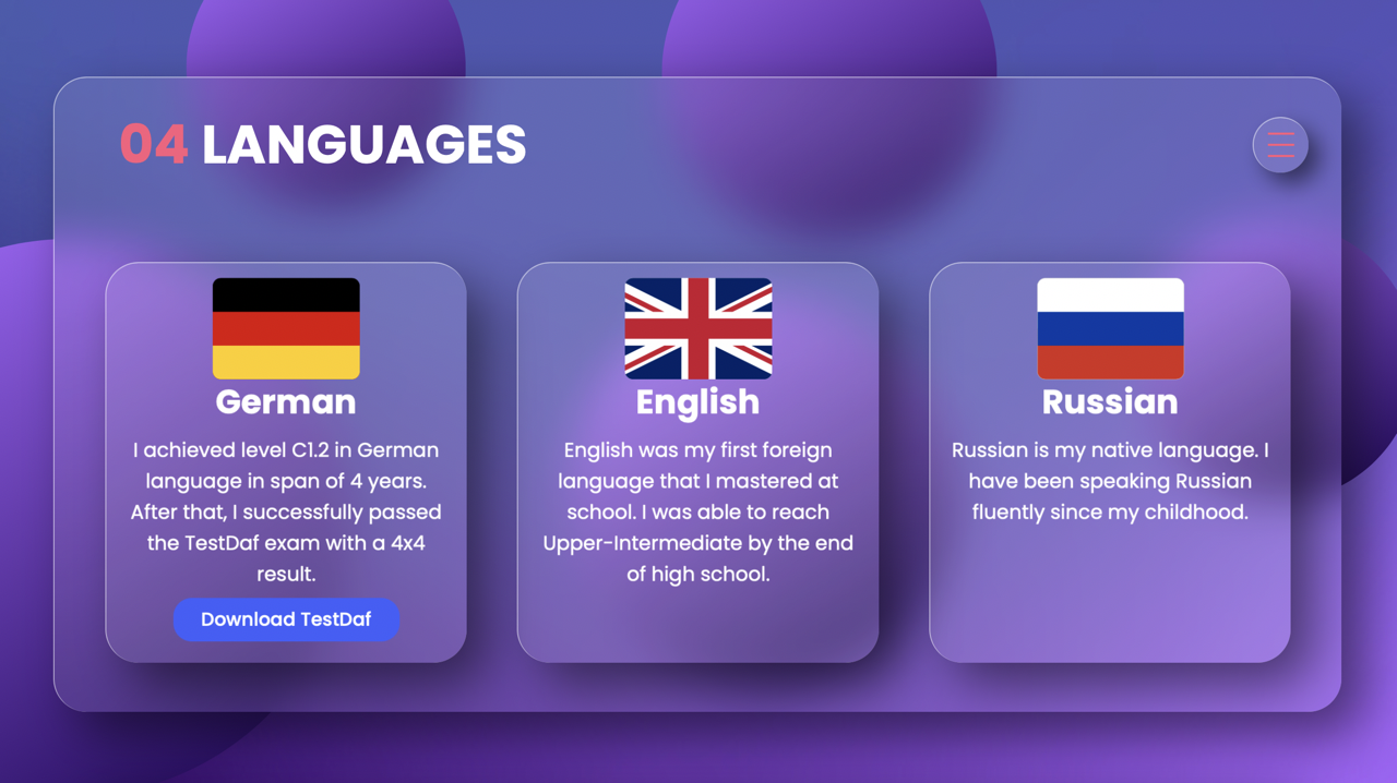 I created this portfolio website to demonstrate all necessary information about myself, such as my recent work experiences, education and wide range of skills, including programming, photography and language proficiency.